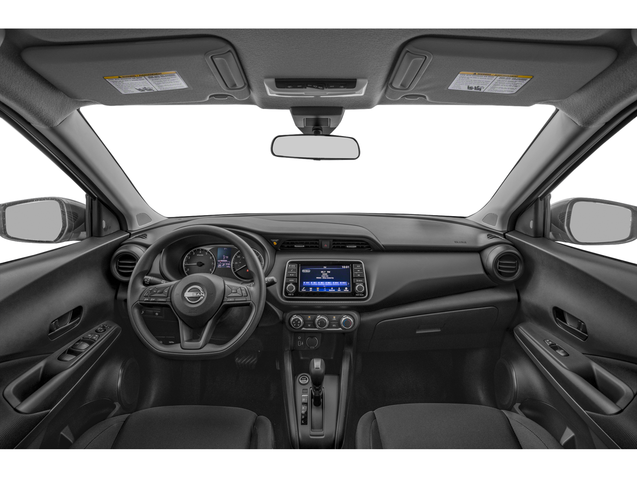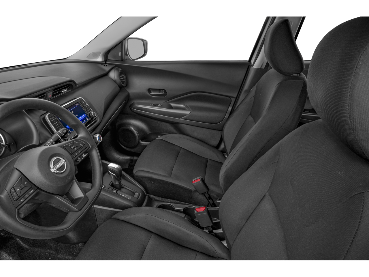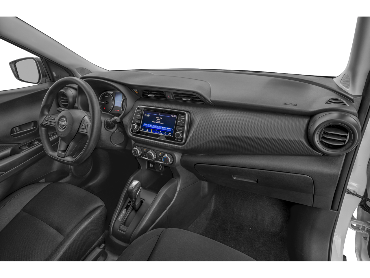 Step inside the Kicks S, and you'll be greeted by a well-appointed interior that prioritizes both style and functionality. Cloth seat trim, a sport steering wheel, and a host of convenience features, including steering wheel-mounted audio controls and an AM/FM audio system, ensure a comfortable and connected driving experience.